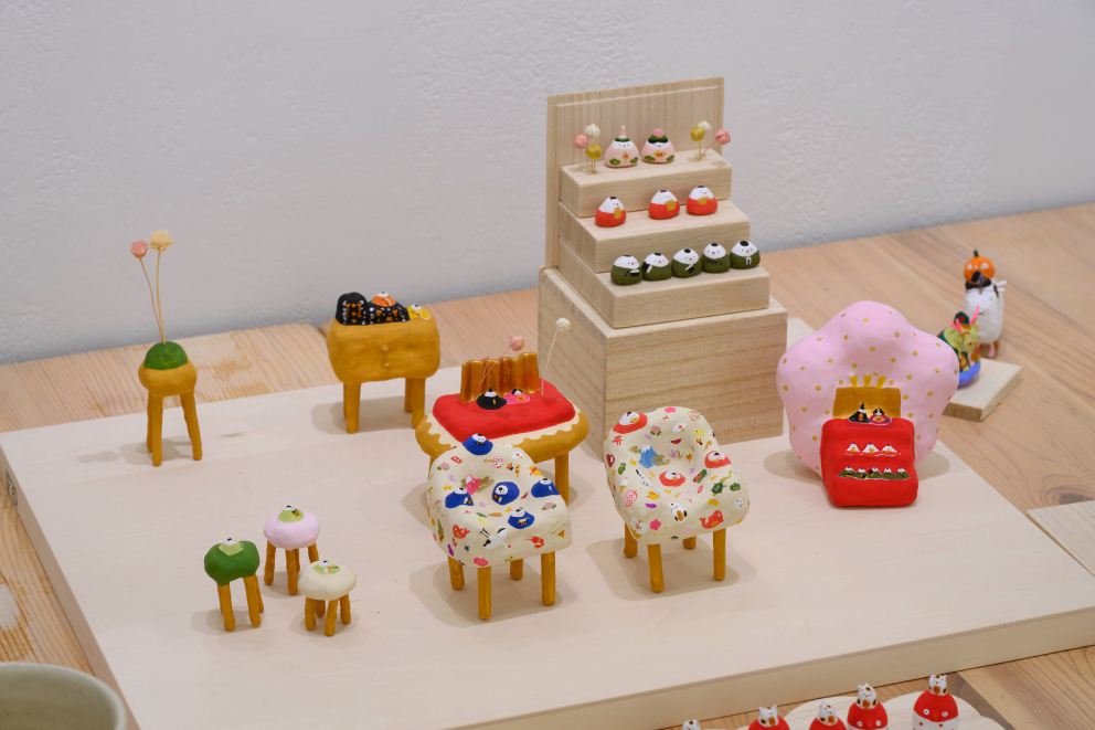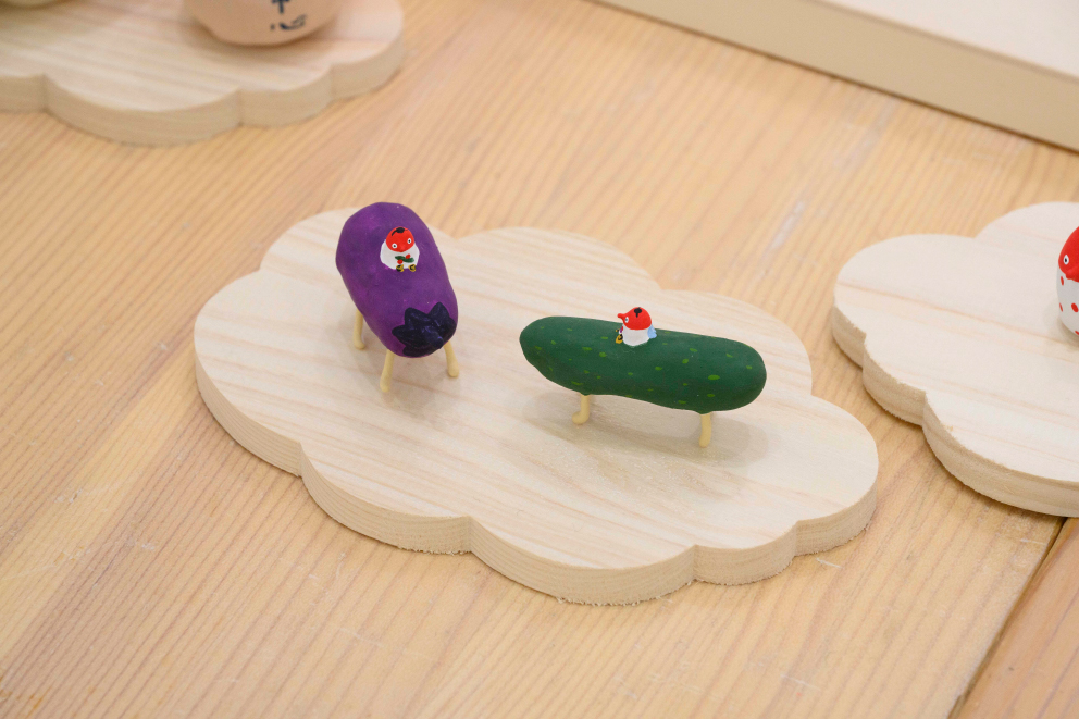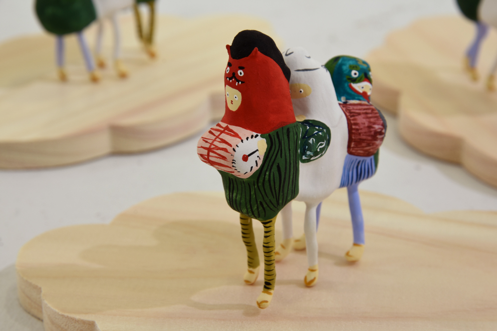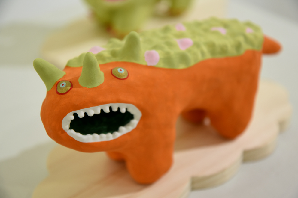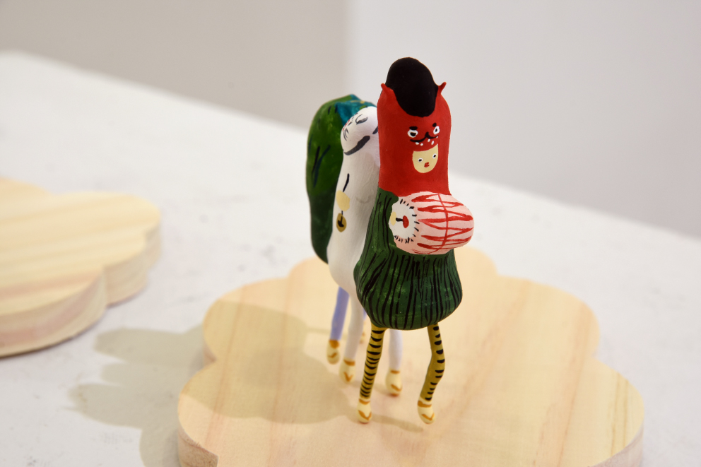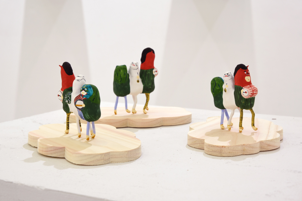 張り子や陶器、絵画、銅版画などで、カラフルな「絵本のような世界」を形にする展示