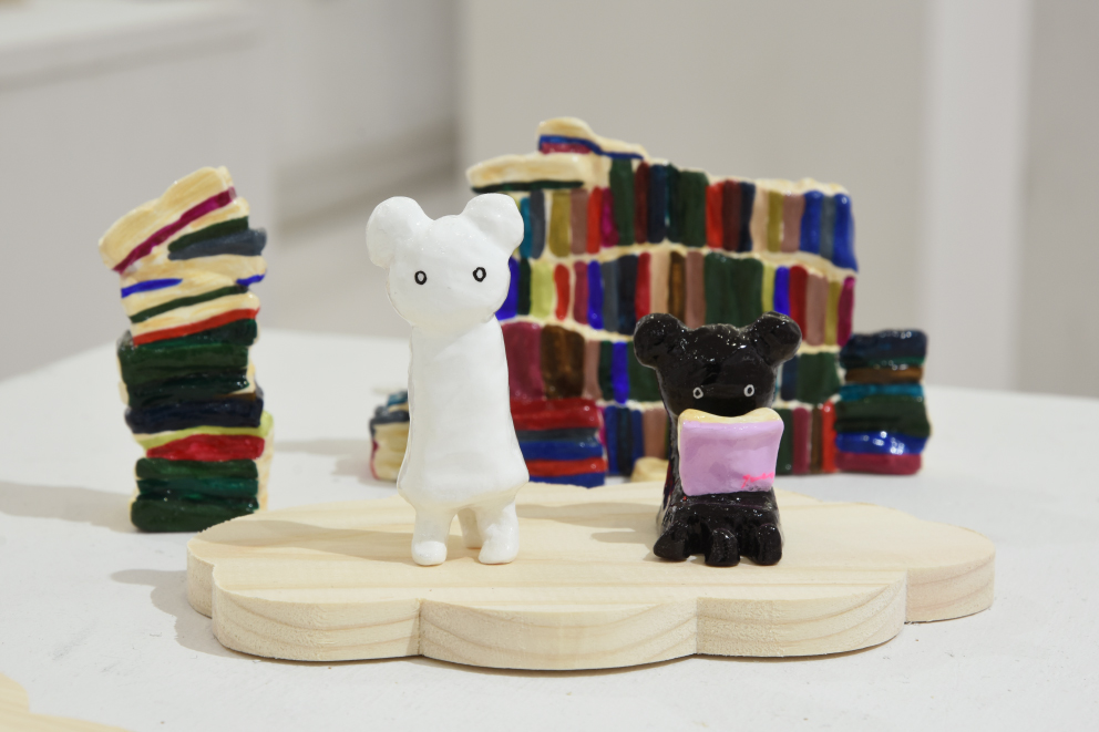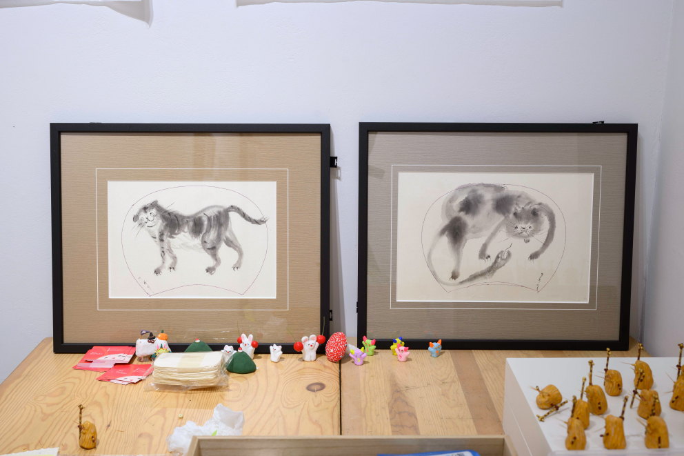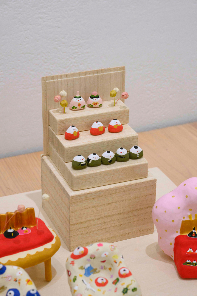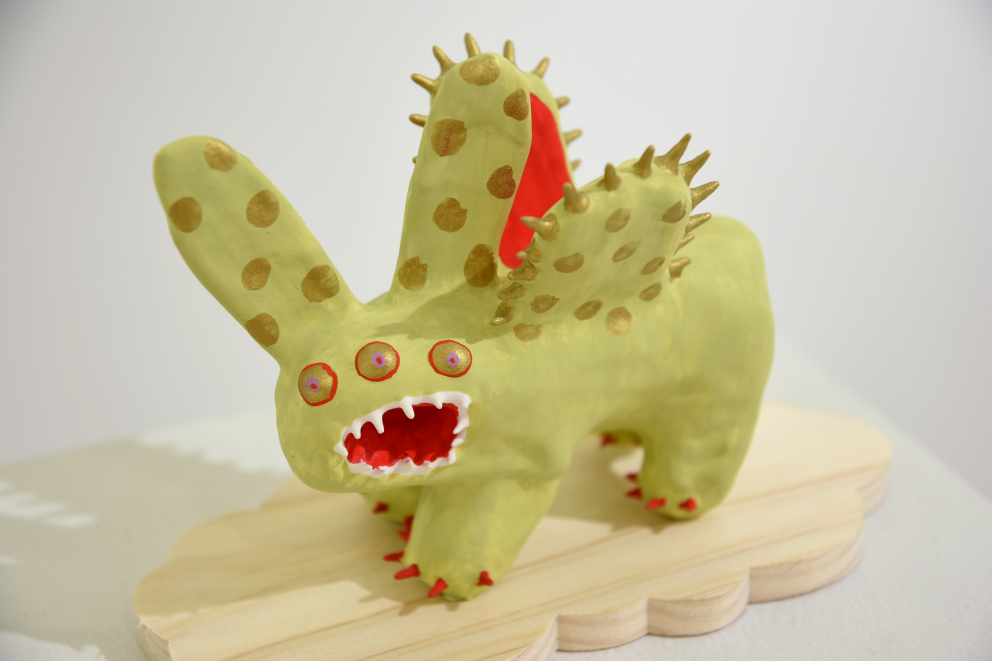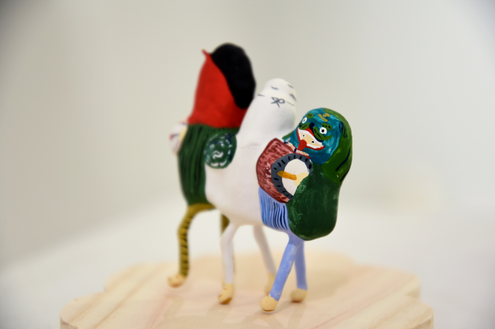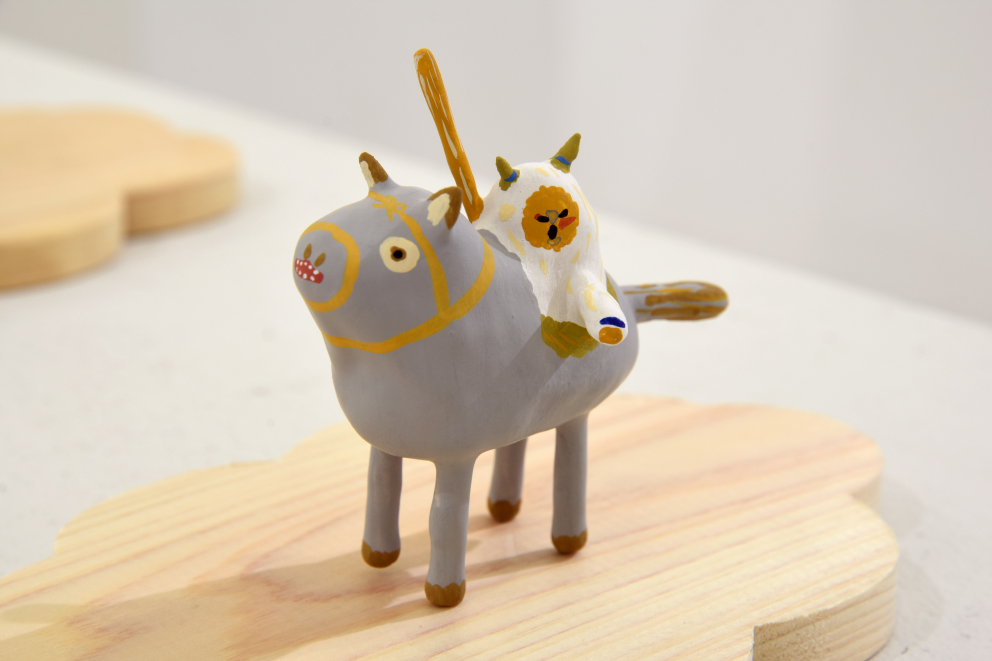 張り子や陶器、絵画、銅版画などで、カラフルな「絵本のような世界」を形にする展示